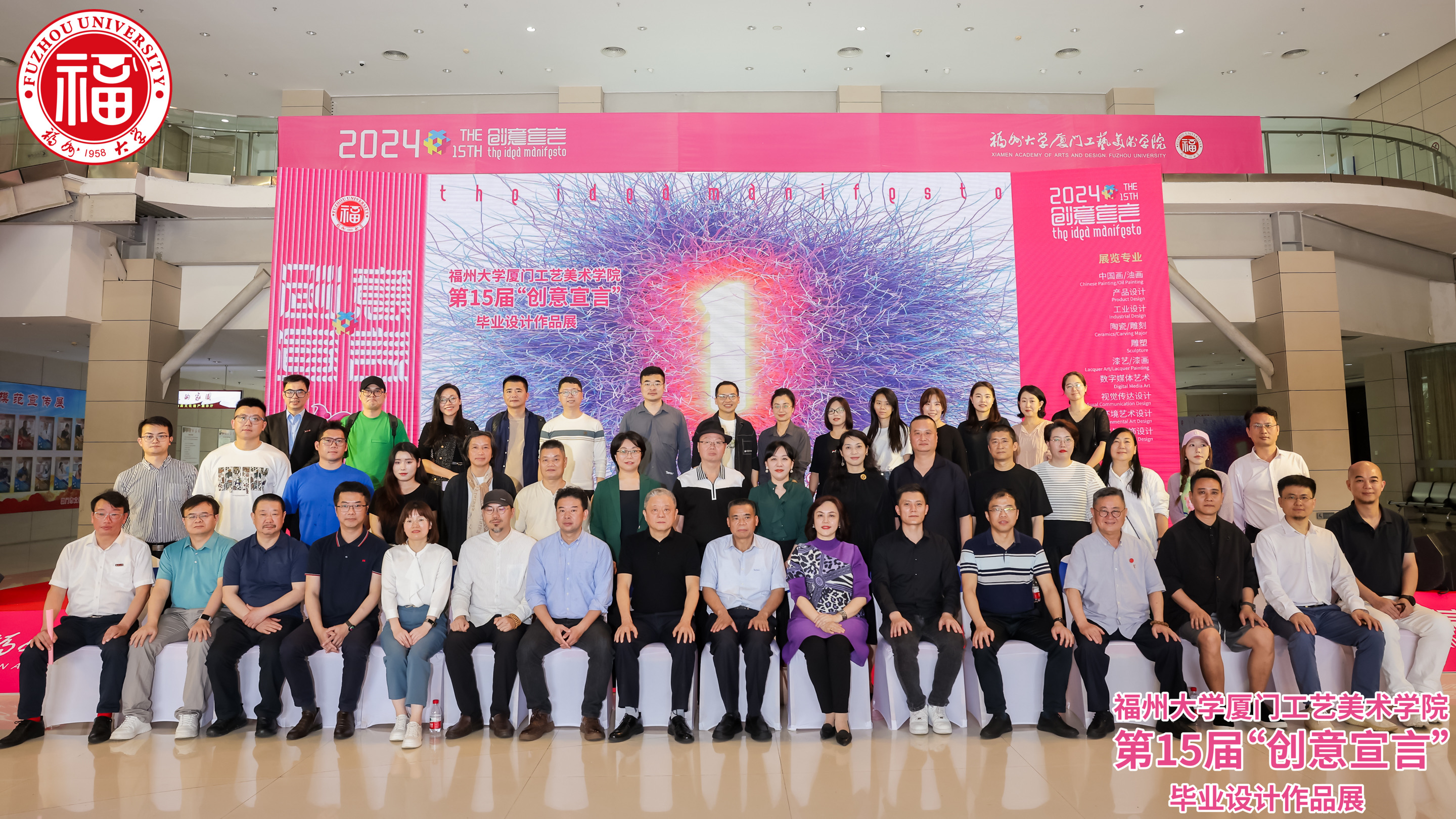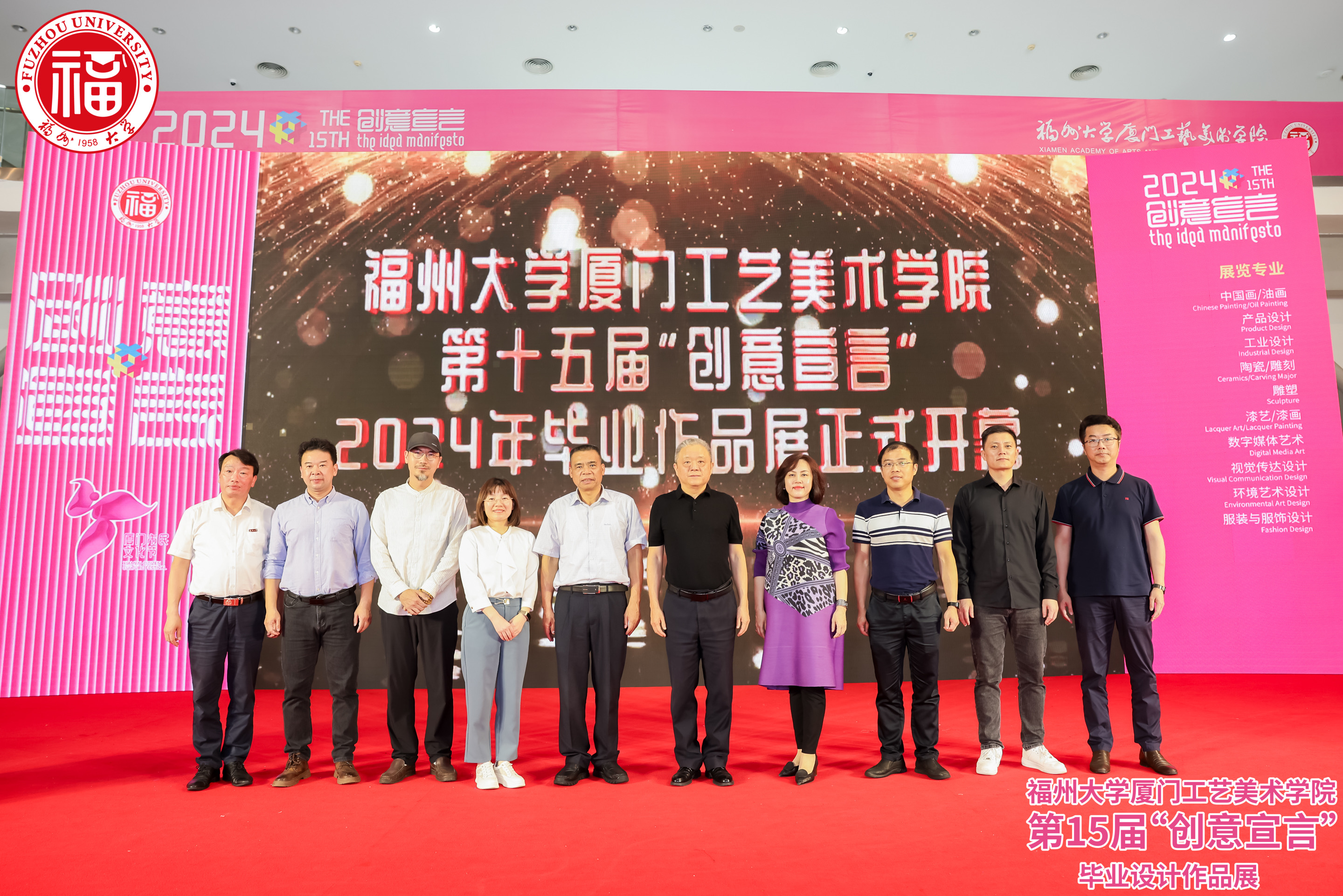 鄢荣钗主任、秦俭院长、戴华妮馆长、林永潮院长、李文峰教授、邹敏华总监、王海龙书记、张健副院长、黄志雄主席等上台共同触屏启动开幕仪式,林金强副书记宣布毕业作品展开幕。与会嘉宾与出席开幕式的学院领导、老师合影留念后共同参观展览。
