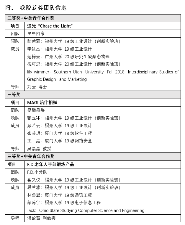 学院工业设计系2019级张玉冰(创新实验班)、陆茜蒙(创新实验班)和翟又仪(创新实验班)三位同学领衔的三个项目“追光”与“MAGI陪伴相框”和“F.D.老年人手部锻炼产品”,分别斩获总决赛三等奖;而威尼斯886699以晋级总决赛项目最多、获奖项目最多,与华中科技大学并获“最佳组织奖”。
